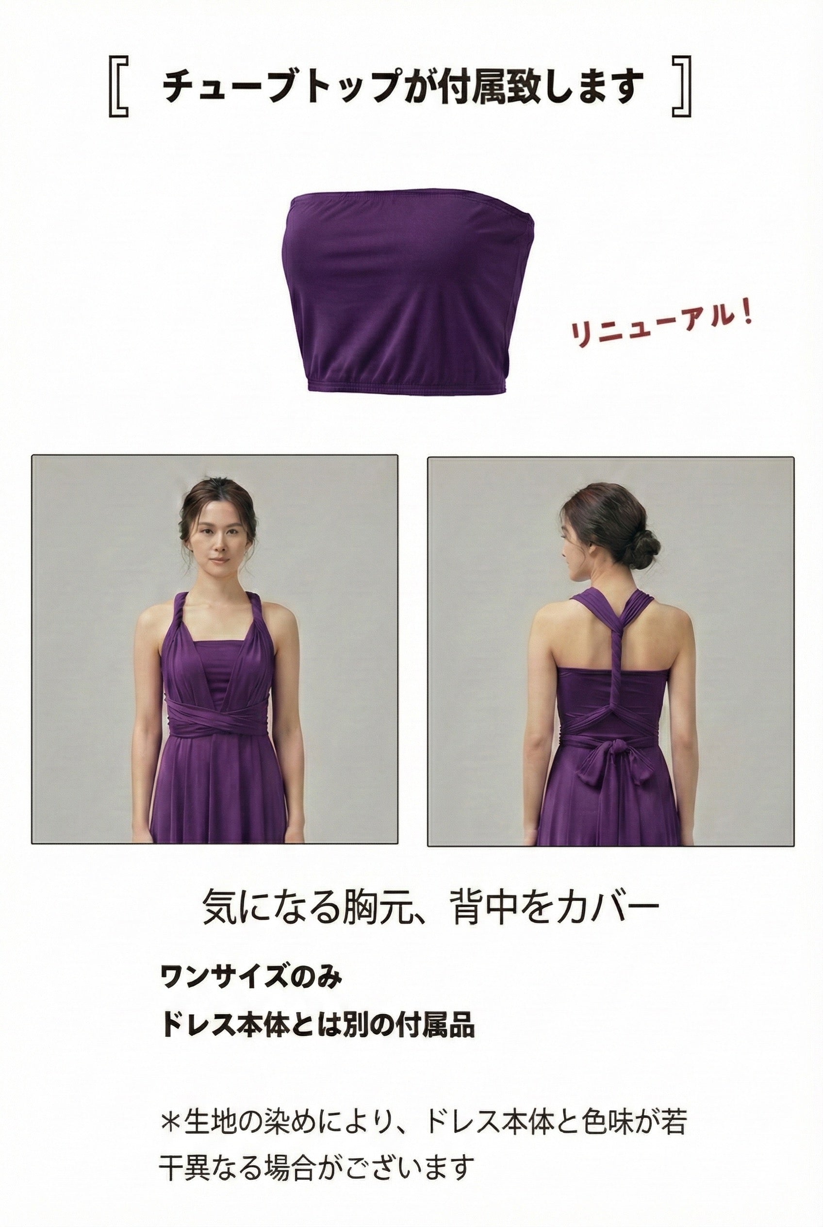インナーとして使えるチューブトップ(ワンサイズ)が付属。アレンジの幅がさらに広がります。